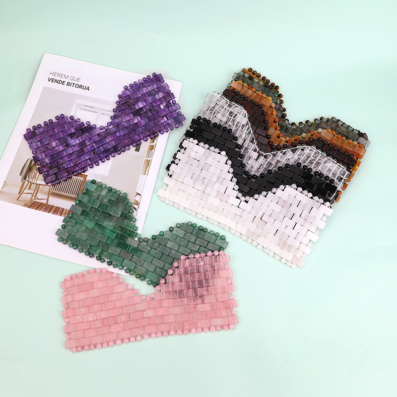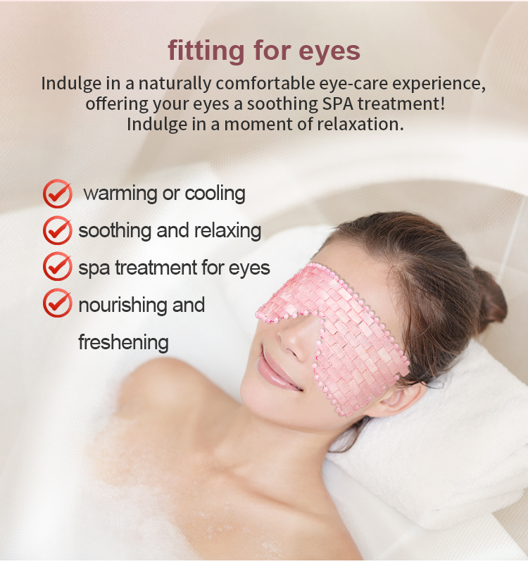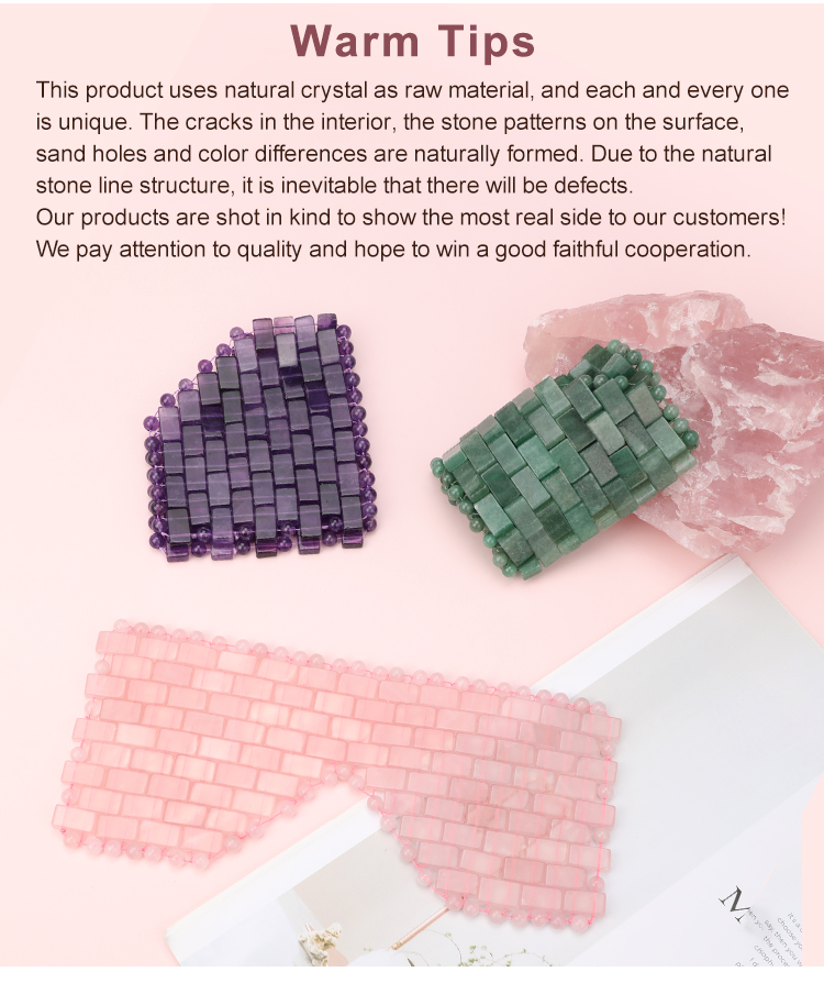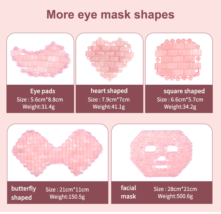 The complete product is hand - woven by our technical staff using individual pieces and beads.Made of 100% natural rose quartz stone, it delivers a natural cooling effect to soothe eye fatigue, reduce puffiness, and calm the eye area—rose quartz is also valued for its gentle, skin-soothing properties. The beaded structure fits the eye area closely, and the adjustable chain ensures a comfortable, secure fit for different face shapes, maximizing contact between stones and skin. Dimensions (21.5*9.5cm) and weight (182g) balance coverage of the eye area with comfortable wear, suitable for rest, skincare routines, or travel relaxation.